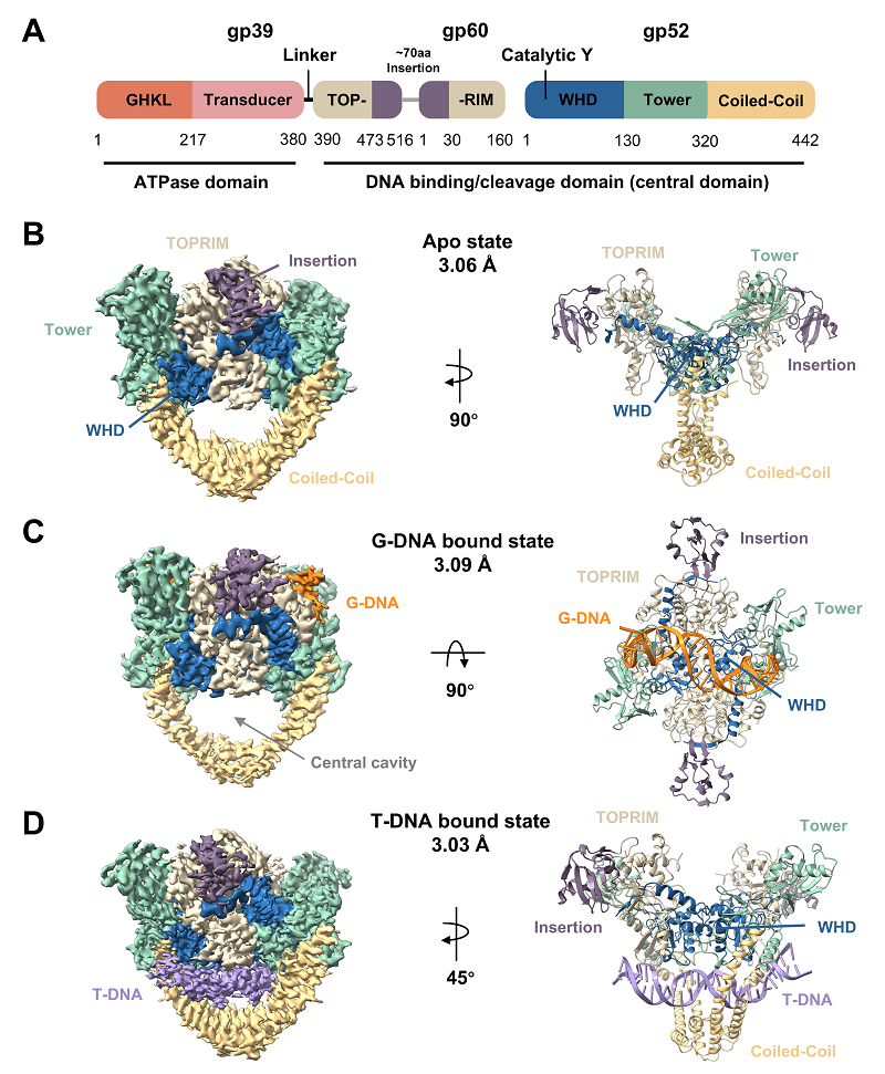 Cryo-EM structures of the central domain of T4 phage type II DNA topoisomerase in its Apo state, bound to gate-segment DNA, and bound to transport-segment DNA (Image by RAO Zihe's group)